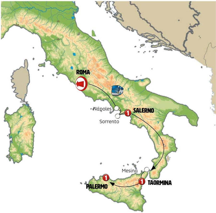 ROMA, NAPOLES, CAPRI, SORRENTO, SALERNO, PAOLA, MESINA, TAORMINA, CALTAGIRONE, VILLA ROMANA DEL CASALE, PALERMO