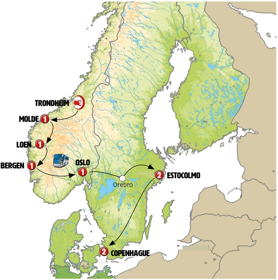 TRONDHEIM, KRISTIANSUND, CARRETERA ATLANTICA, MOLDE, GEIRANGER, BRIKSDAL, LOEN, BERGEN, EIDFJORD, VORINGFOSSEN, GEILO, OSLO, OREBRO, ESTOCOLMO