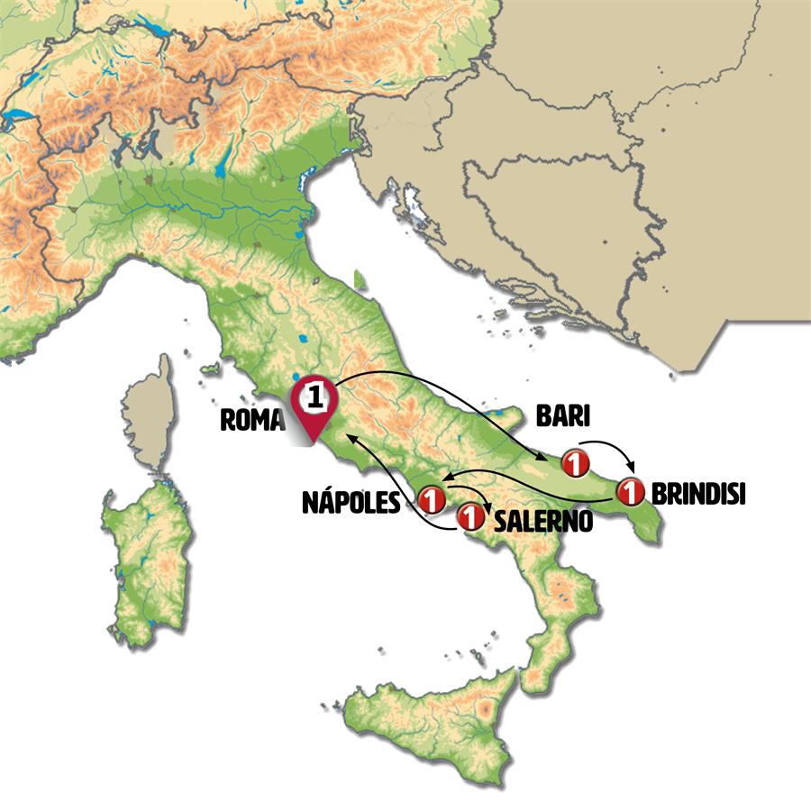 ROMA, ABADIA SAN GIOVANNI IN VENERE, TÉRMOLI, BARI, BRÍNDISI, LECCE, GALLIPOLI, ALBEROBELLO, MATERA, NÁPOLES, CAPRI, SORRENTO, SALERNO, POMPEYA, CASSINO