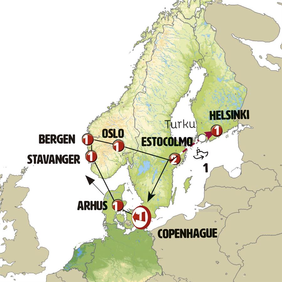 COPENHAGUE, ODENSE, AARHUS, FERRI KRISTIANSAND, KRISTIANSAND, STAVANGER, BERGEN, FIORDO DE SOGN, OSLO, OREBRO, ESTOCOLMO, ELSINOR