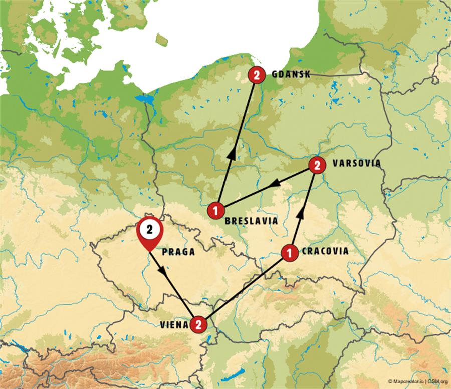 PRAGA, CESKÉ BUDEJOVICE, CESKY KRUMLOV, VIENA, BRATISLAVA, TRENCIN, CRACOVIA, AUSCHWITZ, CZESTOCHOWA, VARSOVIA, WROCLAW, POZNAN, TORUN, GDANSK
