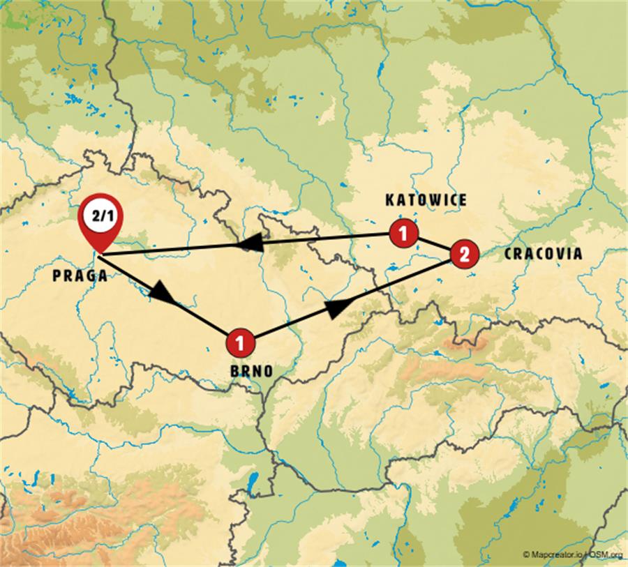 PRAGA, BRNO, BRATISLAVA, TRENCIN, CRACOVIA, KALWARIA ZEBRZYDOWSKA, BARWALD DOLNY, WADOWICE, AUSCHWITZ, KATOWICE, OPOLE, WROCLAW