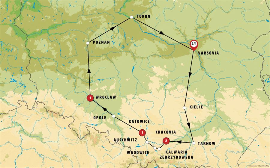 VARSOVIA, KIELCE, TARNOW, CRACOVIA, KALWARIA ZEBRZYDOWSKA, BARWALD DOLNY, WADOWICE, AUSCHWITZ, KATOWICE, OPOLE, WROCLAW, POZNAN, TORUN