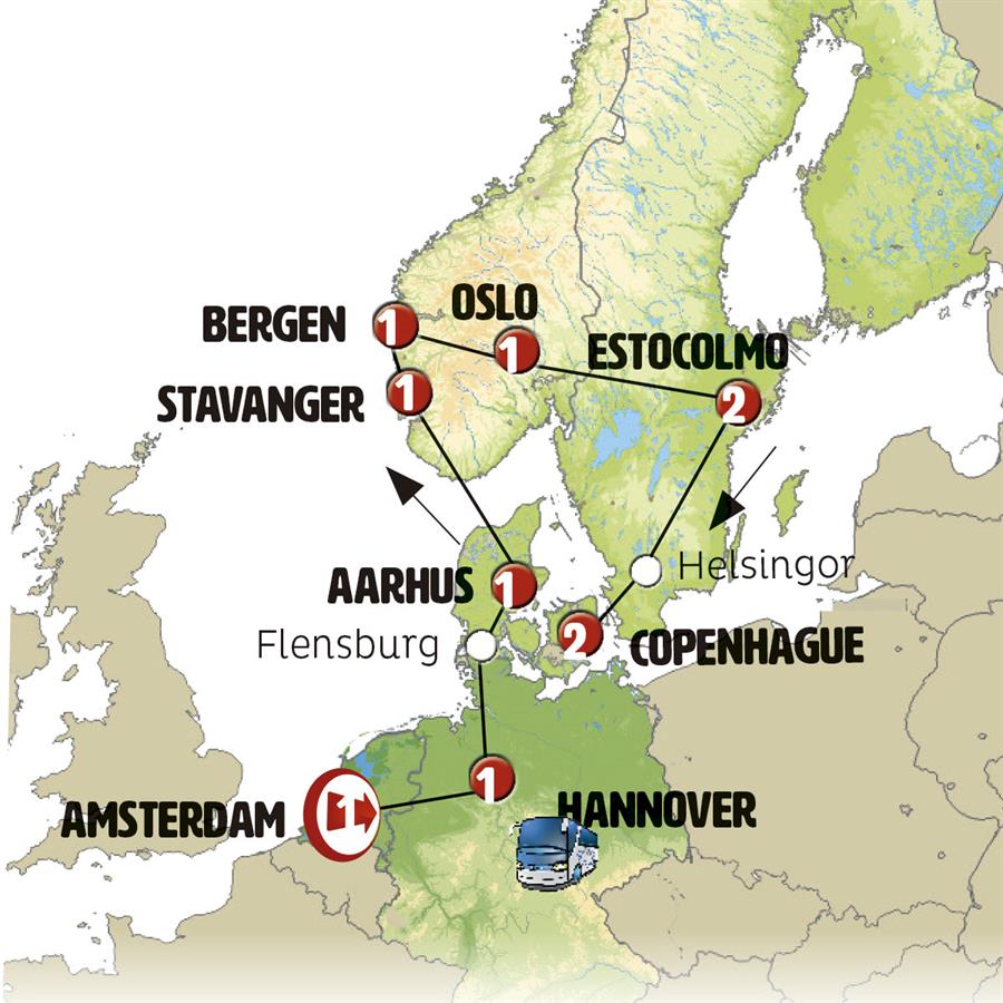 ÁMSTERDAM, HANNOVER, HAMBURGO, FLENSBURG, AARHUS, FERRI KRISTIANSAND, KRISTIANSAND, STAVANGER, BERGEN, FIORDO DE SOGN, OSLO, OREBRO, ESTOCOLMO, ELSINOR, COPENHAGUE