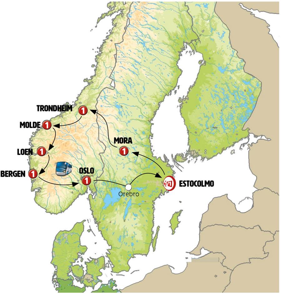 ESTOCOLMO, MORA, FUNASDALEN, ROROS, TRONDHEIM, KRISTIANSUND, CARRETERA ATLANTICA, MOLDE, GEIRANGER, BRIKSDAL, LOEN, BERGEN, EIDFJORD, VORINGFOSSEN, GEILO, OSLO, OREBRO