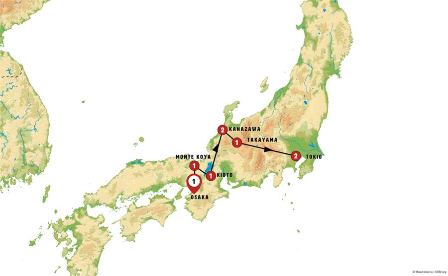 OSAKA, MONTE KOYA, KIOTO, EIHEI-JI, KATSUYAMA-MUSEO DE LOS DINOSAURIOS, KATSUYAMA, KANAZAWA, AINOKURA, SHIRAKAWAGO, ALDEA DE HIDA, TAKAYAMA, HIDA FURUKAWA, MATSUMOTO, TOKIO