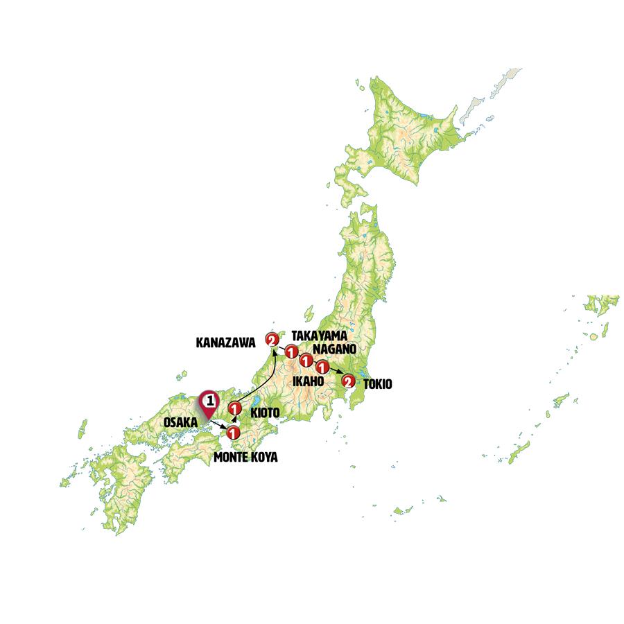 OSAKA, MONTE KOYA, KIOTO, EIHEI-JI, KATSUYAMA-MUSEO DE LOS DINOSAURIOS, KATSUYAMA, KANAZAWA, AINOKURA, SHIRAKAWAGO, ALDEA DE HIDA, TAKAYAMA, HIDA FURUKAWA, MATSUMOTO, NAGANO, PARQUE DE LOS MONOS, KUSATSU, IKAHO, NIKKO, TOKIO