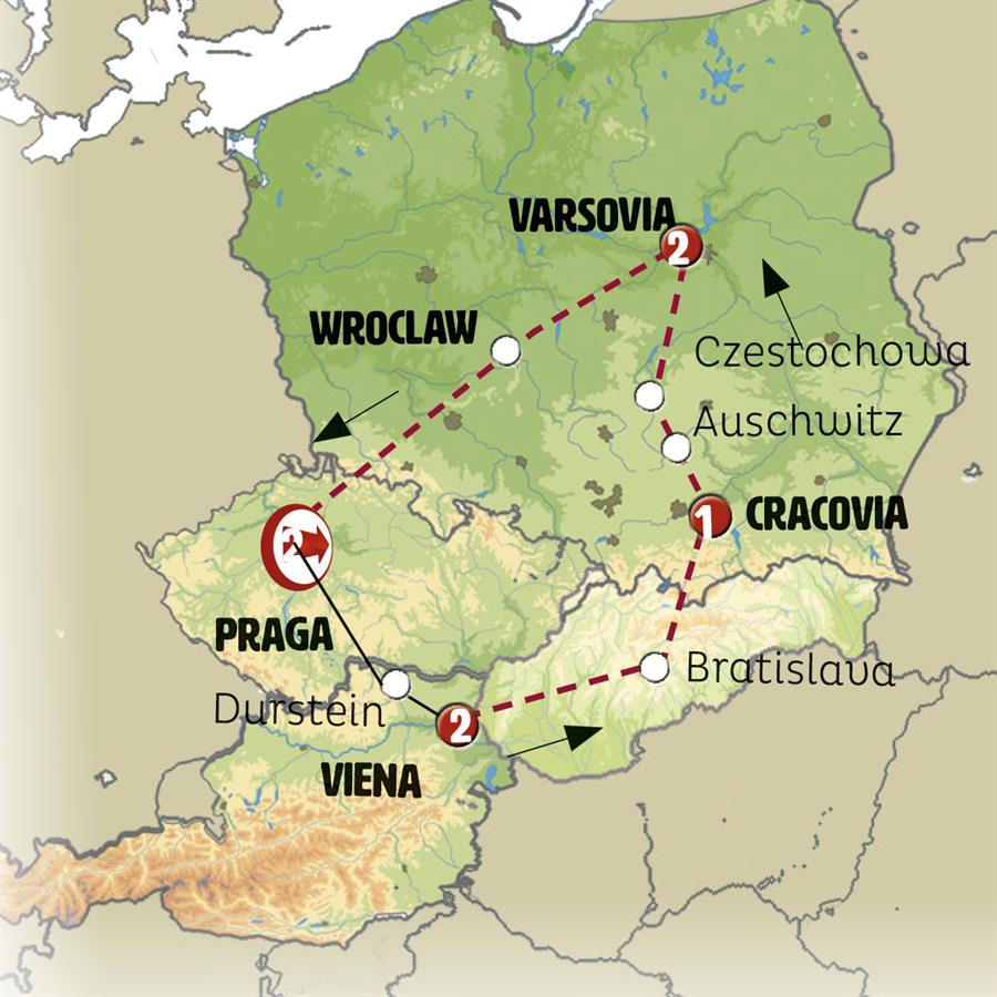 PRAGA, CESKÉ BUDEJOVICE, CESKY KRUMLOV, VIENA, BRATISLAVA, TRENCIN, CRACOVIA, AUSCHWITZ, CZESTOCHOWA, VARSOVIA, WROCLAW