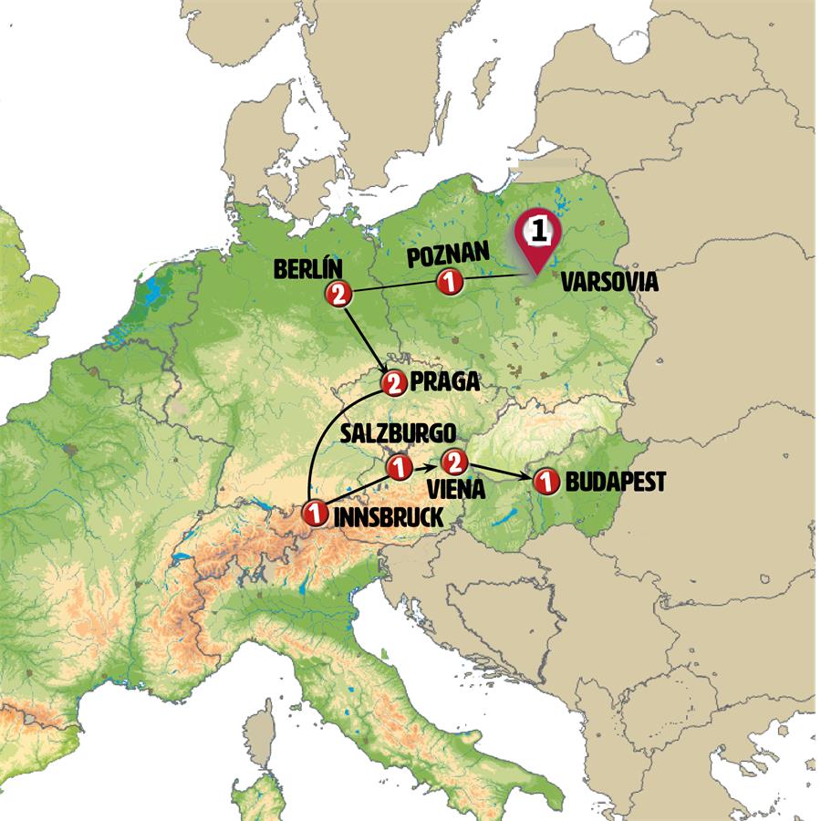VARSOVIA, POZNAN, BERLÍN, DRESDE, PRAGA, MÚNICH, INNSBRUCK, SALZBURGO, LAGO TRAUNSEE, VIENA, BUDAPEST