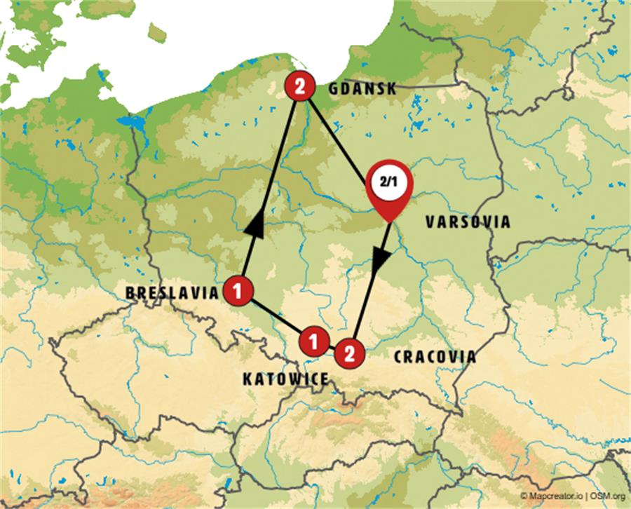 VARSOVIA, KIELCE, TARNOW, CRACOVIA, KALWARIA ZEBRZYDOWSKA, BARWALD DOLNY, WADOWICE, AUSCHWITZ, KATOWICE, OPOLE, WROCLAW, POZNAN, TORUN, GDANSK, MALBORK, FROMBORK, ELBLAG