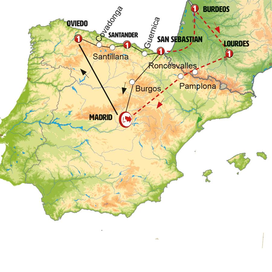 MADRID, LEÓN, OVIEDO, COVADONGA, SANTILLANA DEL MAR, SANTANDER, BILBAO, GUERNICA, SAN SEBASTIÁN, BURGOS
