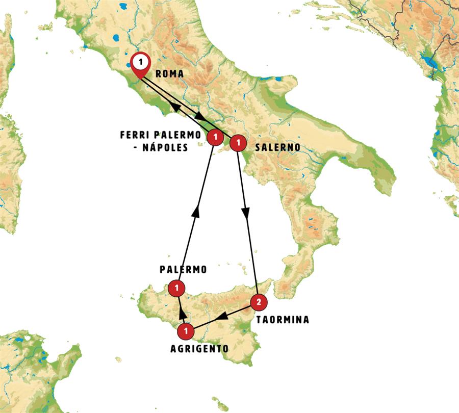 ROMA, NÁPOLES, CAPRI, SORRENTO, SALERNO, PAOLA, MESINA, TAORMINA, CATANIA, SIRACUSA, AGRIGENTO, MARSALA, ERICE, PALERMO, MONREALE, FERRI PALERMO - NÁPOLES, POMPEYA