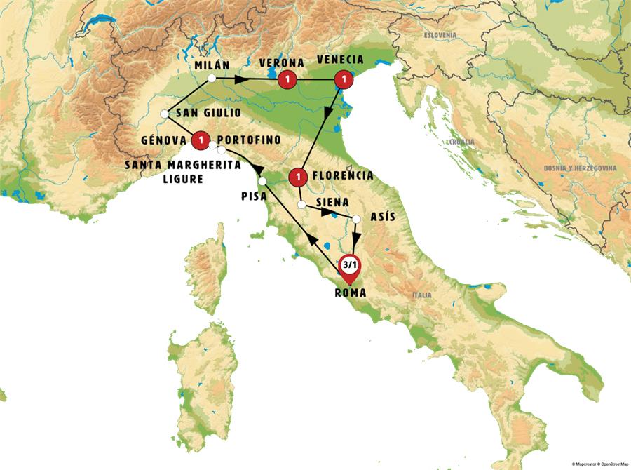 ROMA, PISA, SANTA MARGHERITA LIGURE, PORTOFINO, GÉNOVA, SAN GIULIO, MILÁN, VERONA, VENECIA, FLORENCIA, SIENA, ASÍS