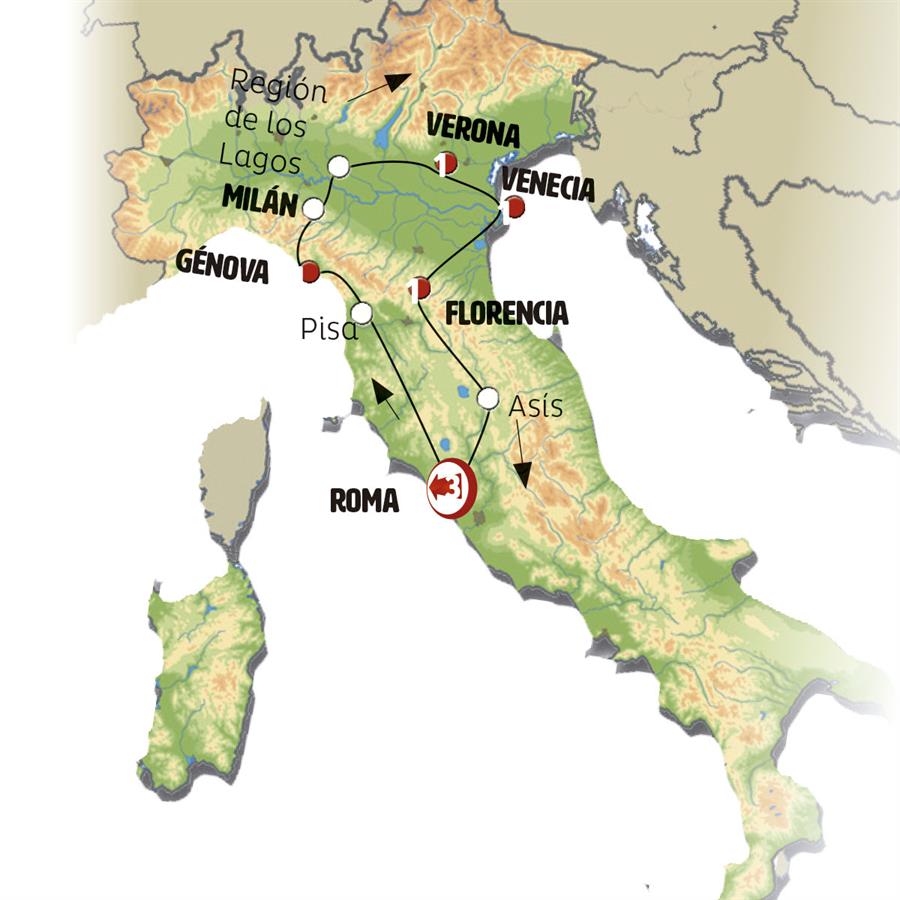 ROMA, PISA, SANTA MARGHERITA LIGURE, PORTOFINO, GÉNOVA, SAN GIULIO, MILÁN, VERONA, VENECIA, FLORENCIA, SIENA, ASÍS