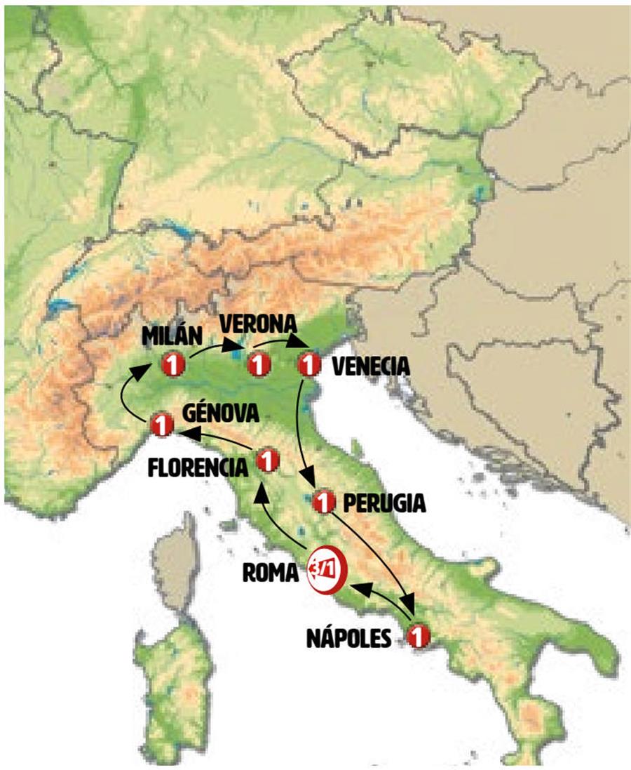 ROMA, FLORENCIA, PISA, CINQUE TERRE, GÉNOVA, PORTOFINO, MILÁN, REGIÓN DE LOS LAGOS, VERONA, VENECIA, PADUA, SAN MARINO, GUBBIO, PERUGIA, ASÍS, NÁPOLES, CAPRI, POMPEYA