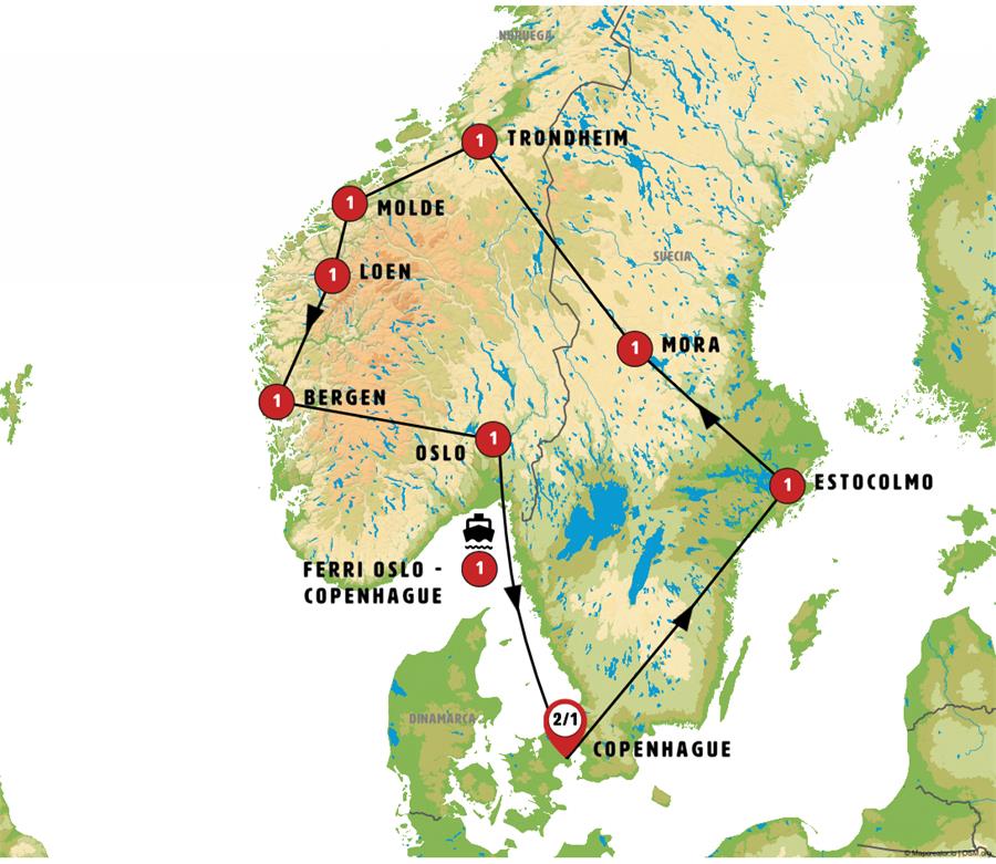 COPENHAGUE, JONKOPING, VADSTENA, ESTOCOLMO, MORA, FUNASDALEN, ROROS, TRONDHEIM, KRISTIANSUND, CARRETERA ATLANTICA, MOLDE, GEIRANGER, BRIKSDAL, LOEN, BERGEN, EIDFJORD, VORINGFOSSEN, GEILO, OSLO, FERRI OSLO COPENHAGUE